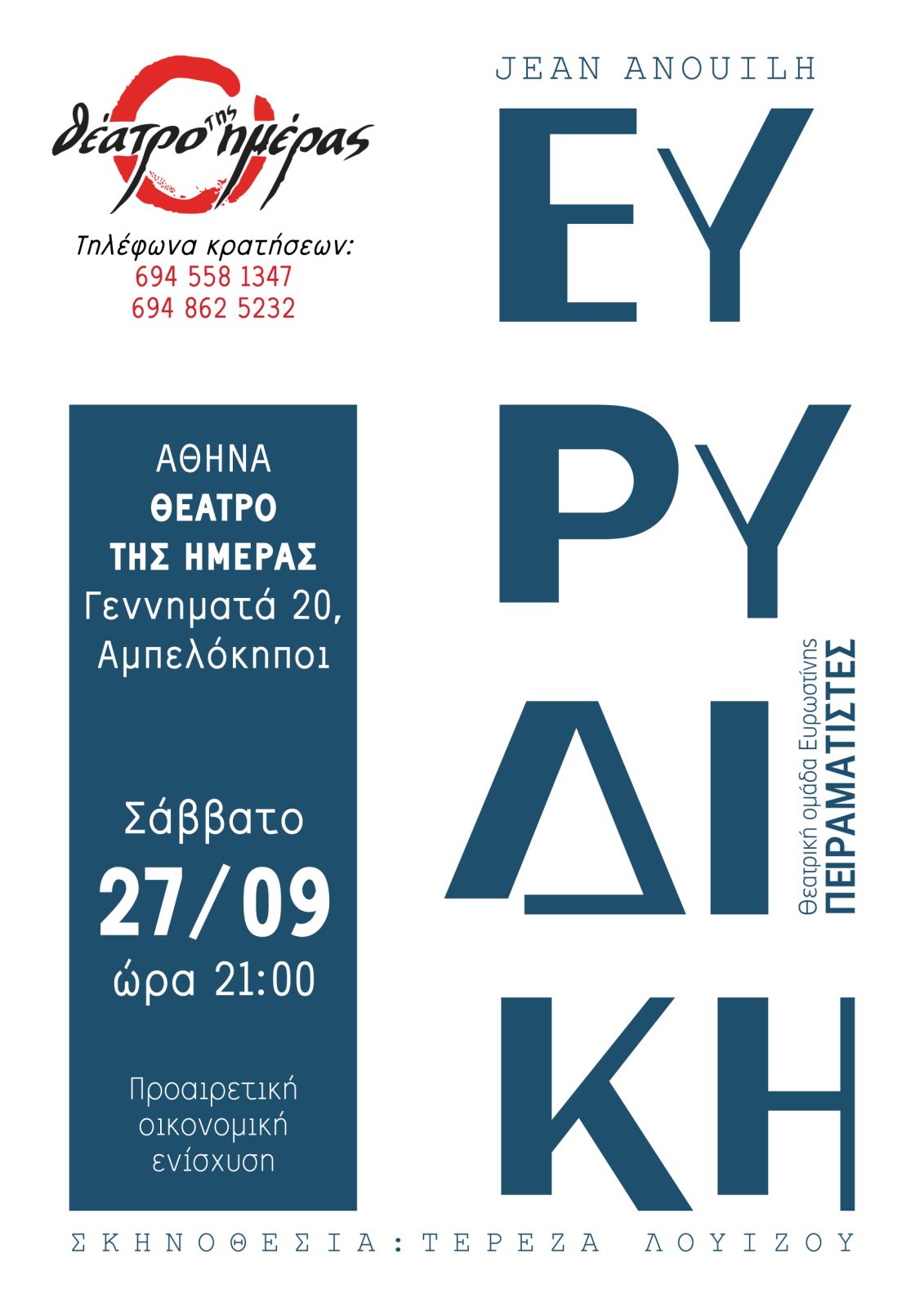 Ο Ζαν Ανούιγ, ο σύγχρονος αυτός δραματουργός, χρησιμοποιεί τον αρχαίο ελληνικό μύθο του Ορφέα και της Ευρυδίκης για να μας δώσει ένα νέο κόσμο. Έναν κόσμο ερωτευμένο με την τέλεια αγνότητα και την υπέρτατη ομορφιά. Έναν κόσμο που έχει ξεπεράσει τις διαστάσεις του χώρου και του χρόνου. Η Ευρυδίκη του Ανούιγ δεν είναι Δρυμαία νύμφη, αλλά ηθοποιός σ’ ένα θλιβερό «μπουλούκι». Κι ο Ορφέας, πλανόδιος μουσικός που μαζεύει δεκάρες στα επαρχιακά καφενεία. Ο έρωτας που γεννιέται ανάμεσά τους απ’ την πρώτη στιγμή, τους κάνει ν’ απαρνηθούν το παρελθόν και το περιβάλλον τους. Όμως, είναι αυτά ακριβώς που θα δώσουν το θάνατο στην Ευρυδίκη – όχι το φίδι του Αριστέα. Ο Ορφέας φτάνει στον Κάτω κόσμο θέλοντας να την επαναφέρει στη ζωή. Δεν πρέπει να την κοιτάξει μέχρι την αυγή. Αλλά… ο έρωτάς τους, ο αγνός, ο απόλυτος, ο τέλειος μόνο στο θάνατο μπορεί να ζήσει!